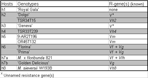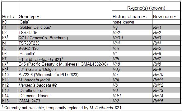 This set of differential host reflects the knowledge of the V. inaequalis-Malus pathosystem of June 2008. The set will be up-dated each time new apple scab R-genes are discovered and sufficient plant material is available. Currently Rvi16 discovered in MIS op 93.051 G07-098 (Bus et al. 2010) and Rvi17 of Antonovka APF22 (Dunneman and Egerer 2010) are missing in the set. As soon plant material of these genotypes will be available, they will be added to the set.
